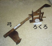 左の写真は実際当店で使われていたふとんを打直す道具です。綿打ちが機械化される中、明治から大正まで使用されました。写真の「弓」と「ろくろ」と呼ばれるものは実際に当店の創業期に使用されていたものであり、一部の道具は当店より、千葉県立上総博物館に寄贈し展示されておりました。 ■ろくろ(綿くり)・・・収穫した綿はろくろのローラーの間に綿の実を入れ、取手を回す。綿繊維は先に落ち、種は残って下に落ちるという仕組。 ■弓(綿打ち)・・・「綿くり」した綿は固まっているので「弓」という道具で綿をほぐす。 |